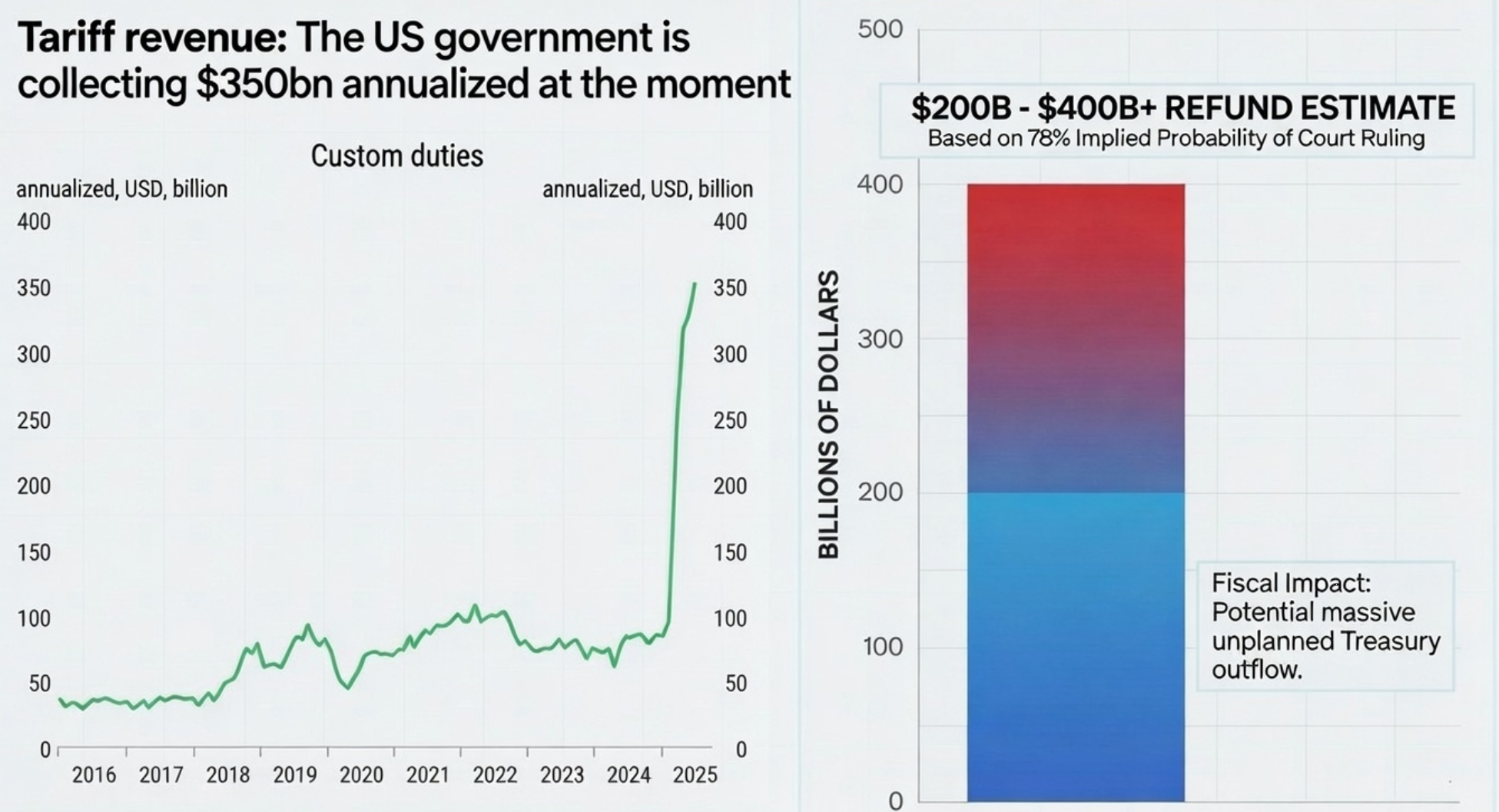 Gre za izjemno pomemben pravni in makroekonomski dogodek, ki bo zagotovo vplival na volatilnost in dogajanje na finančnih trgih. Trumpova administracija, je z uvedenimi carinami, zgolj v letu 2025, pobrala za vsaj okoli $350 milijard. V kolikor bi sodišče razsodilo, da so bili postopki, vezani na carine in uvedbo le teh, neskladni z zakonodajo, bo skoraj zagotovo prišlo do vračanja, vsaj dela pobranih sredstev, kar bo imelo precejšen negativen učinek na ameriške javne finance in na likvidnost finančnih trgov. Trenutno se ocenjuje, da je verjetnost takšnega dogodka kar nekje med 75% in 78%, glede na podobne predhodne razsodbe.